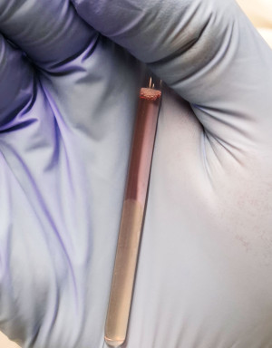 Dr Themistoklis Venianakis uses small tubes for the analysis with the NMR. The milky looking sample consists of alginate and gelatine. It provides a scaffold for the cells. For the cells to survive inside the tube, the nutrient solution must have a neutral pH value. This is indicated by the reddish colour. In an acidic environment, the solution would turn yellow.