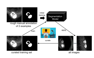 Das Gesamtverfahren generalisiert den iterativen Deep-Learning-Workflow des Allen Cell and Structure Segmenter und entwickelt ihn weiter. Der erwähnte Segmentierer ist ein Toolkit für die 3D-Segmentierung von intrazellulären Strukturen in Fluoreszenzmikroskopiebildern, das von Dr. Jianxu Chen und dem Allen Institute for Cell Science entwickelt wurde. Der erste Schritt der »Smart Human-in-the-loop Segmentation« ist die Entwicklung von effektiven Strategien zum automatischen Auswählen repräsentativer Proben für die anfängliche Kuration oder Annotation basierend auf der bisherigen Arbeit des Teams an suggestiver Annotation, einem Deep-Active-Learning-Framework, das ein vollständig konvolutionales Netzwerk mit aktivem Lernen kombiniert. Als Nächstes werden einige Proben für eine grobe manuelle Annotation durch die Forschenden ausgewählt. Diese werden für das anfängliche Training des Algorithmus für die Segmentierung von Bildern, der anschließend auf alle Bilder in dem Datensatz angewandt wird, verwendet. Danach werden einige Bilder manuell geprüft und zum Trainieren des Algorithmus in den Workflow eingebracht.