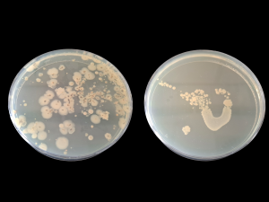 Nach 24 Stunden im Inkubator wird die Ausbeute der Bakterienjagd mit bloßem Auge sichtbar: Die Bakterien aus der Blumenerde (links) und einem Spülschwamm (rechts) haben sich sichtbar vermehrt.
